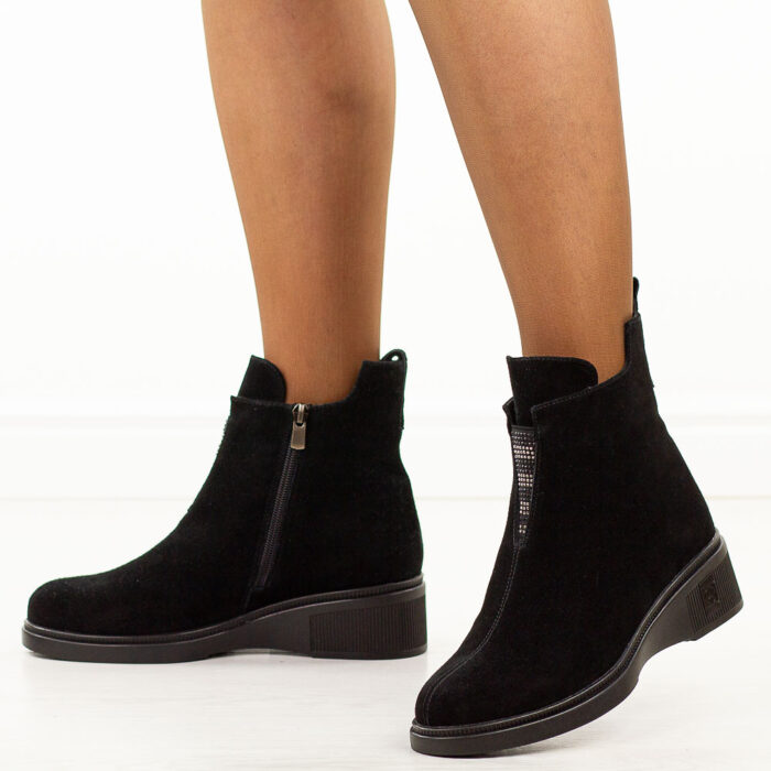 Postaw na czarne zamszowe skórzane botki damskie na koturnie, które łączą wygodę, elegancję i funkcjonalność