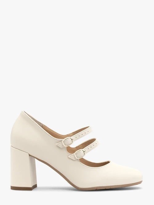 Sprawdź opis dla Kremowe czółenka damskie z dekoracyjnymi paskami i kup taniej. Kremowe czółenka na obcasie typu klocek z linii RYŁKOModel wykonany ze skóry licowej