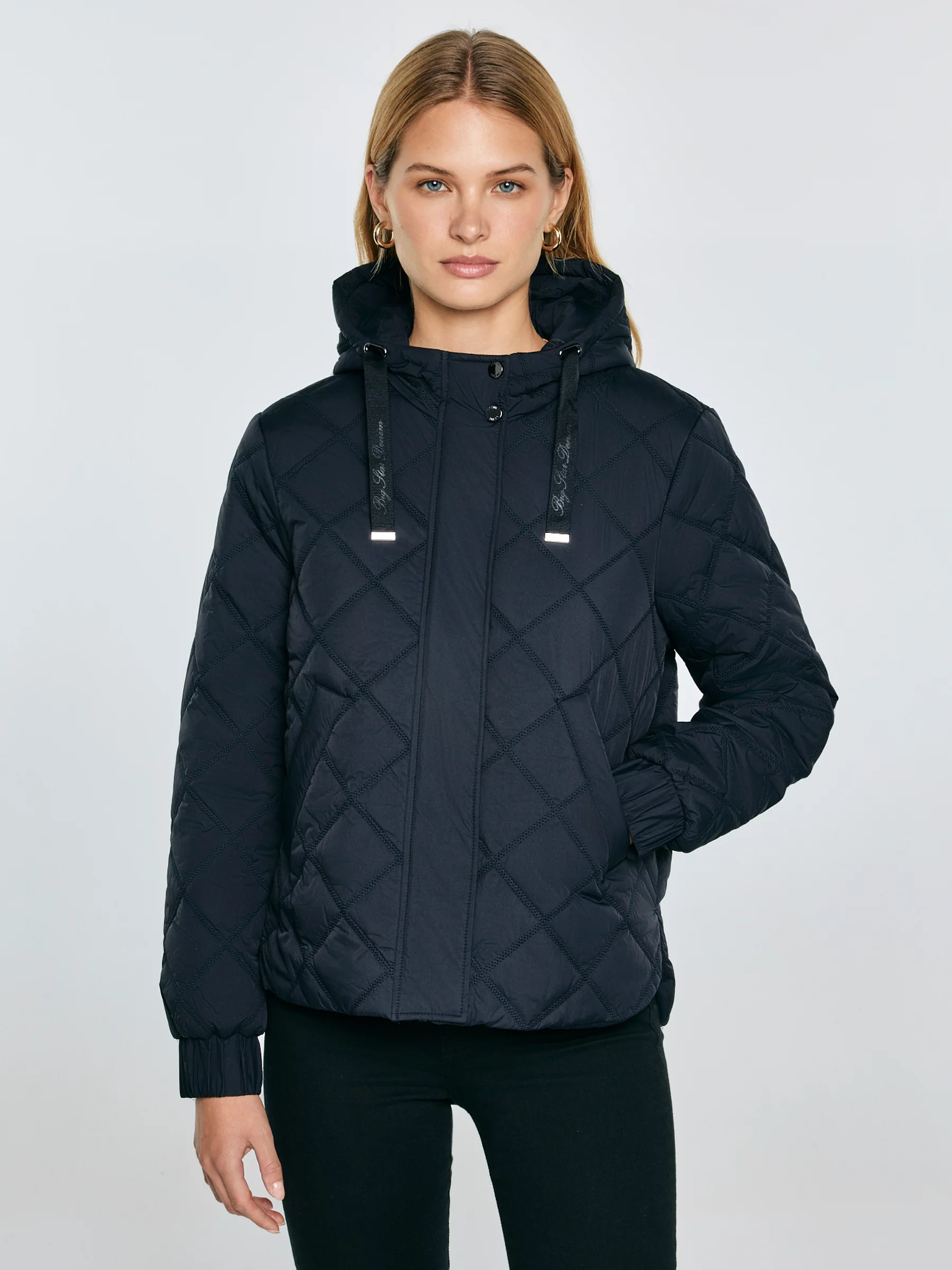 Główne cechy produktu:pikowana kurtka przejściowa z kapturem,zapięcie na zamek kryte listwą z magnetycznymi zatrzaskami,dwie kieszenie na froncie z magnetycznym zapięciem,rękawy z elastyczną taśmą dla lepszego dopasowania,ozdobne detale w złocie i czerni oraz logo ton w ton przy kapturze