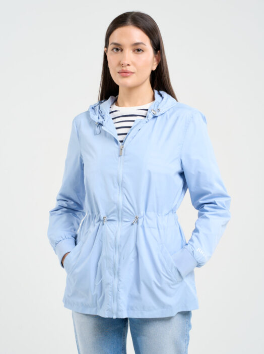 Kurtka damska z regulacją w tali z kapturem błękitna Mira 400