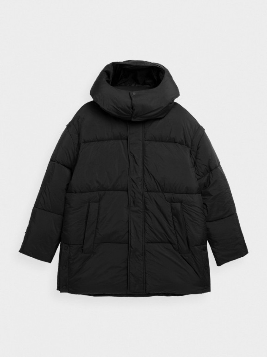 Cechy:krój loose,zakres rozmiarów: XS, S, M, L, XL,odpinany kaptur bez regulacji,wysoki kołnierz chroniący przed chłodem,odpinane rękawy z zamkiem ukrytym pod plisą,dwie kieszenie boczne na zamek i jedna wewnętrzna na rzep,zamek główny zabezpieczony zewnętrzną listwą zapinaną na napy,u dołu po bokach rozpięcia na napy,hydrofobowe wykończenie spowalnia wchłanianie wilgoci,szerokie pikowanie z ociepliną z puchu syntetycznegoSkład materiałowy:Materiał: 100% poliesterWypełnienie: 100% poliester (puch syntetyczny)Krój i dopasowanie:Oversizowy krój loose luźno układa się na sylwetce i zapewnia dużą swobodę