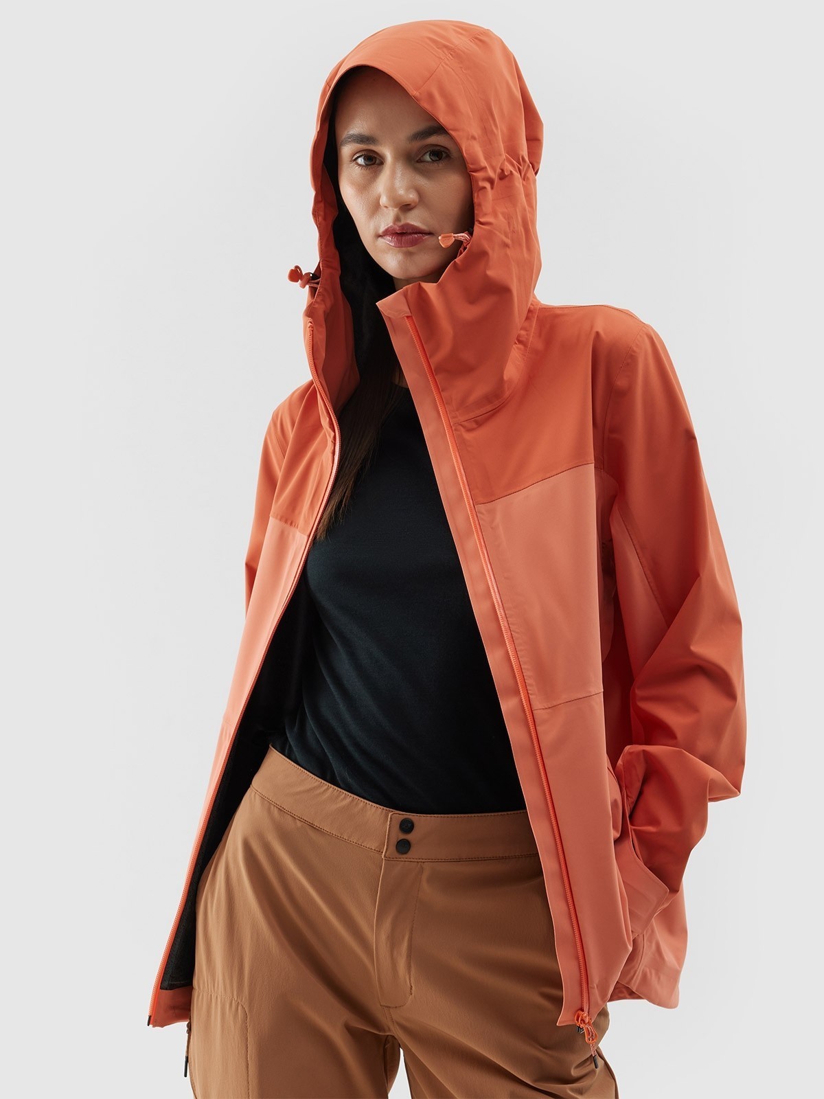 Niezawodne rozwiązania: zintegrowany kaptur i praktyczne kieszenieDamska kurtka trekkingowa z membraną jest wyposażona w zintegrowany kaptur z regulacją objętości oraz profilowanym daszkiem